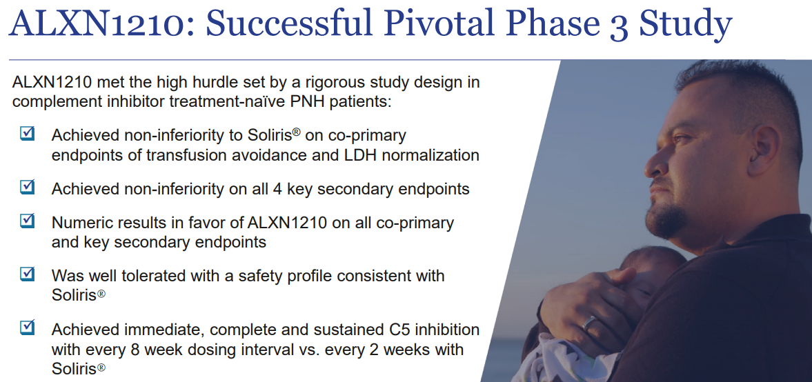 We are very pleased with these positive data for ALXN1210 in the first and only head-to-head study versus Soliris, and the results reinforce our ambition to establish ALXN1210 as the new standard of care for patients with PNH. The data are also consistent with our hypothesis that immediate, complete, and sustained C5 inhibition is critical for patients with this potentially life-threatening disease. Soliris has established a high bar for efficacy. Achieving non-inferiority on both co-primary and all key secondary endpoints, as well as seeing numeric results in favor of ALXN1210, in such a rigorous study met a very high hurdle. We look forward to regulatory submissions of ALXN1210 in PNH in the U.S., EU, and Japan in the second half of 2018.