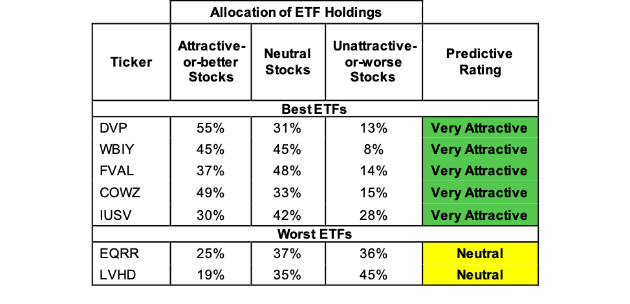 ETF Series Deep Value ETF (DVP) is the top-rated All Cap Value ETF and AIG Focused Dividend Strategy Fund (FDSWX) is the top-rated All Cap Value mutual fund. Both earn a Very Attractive rating.