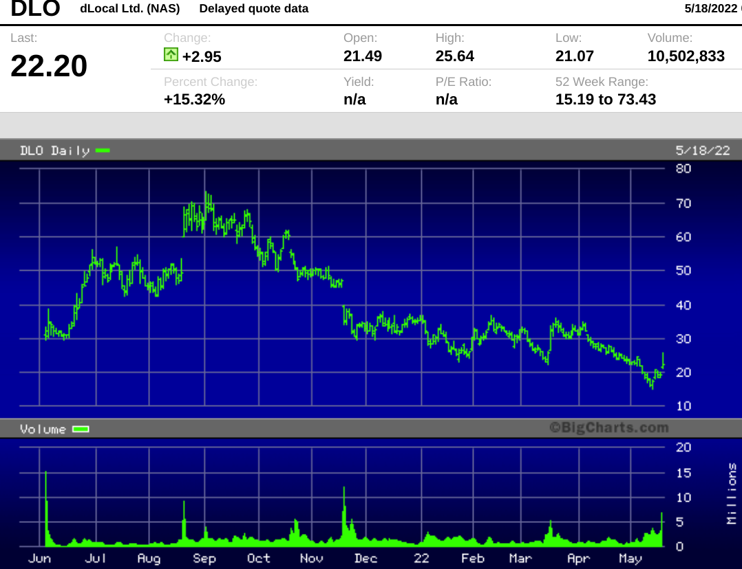 Since peaking in August at $73.43, shares had tumbled 74% through Tuesday's close, before rallying 15% Wednesday after earnings. DLocal was one of the few bright spots in a day that witnessed broad losses across the market.