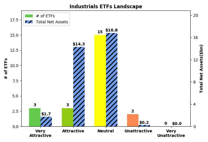 Figures 3 and 4 show the rating landscape of all Industrials ETFs and mutual funds.
