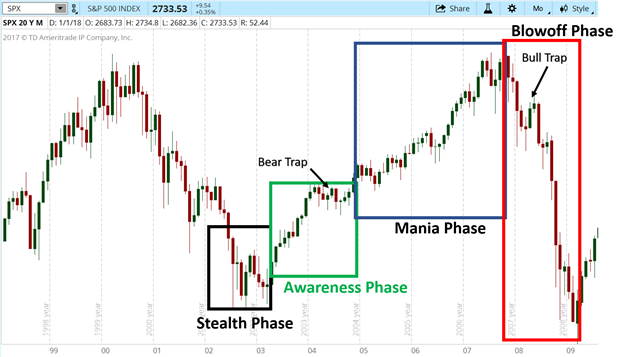 Looking at this all of the phases are pretty easy to see once they have been highlighted. Notice that the Stealth Phase begins as the market is still falling before the rally. This is, because once retail investors begin to panic and sell their securities, the “smart money” will oftentimes step in and buy what they’ve perceived to be good value opportunities, this beginning the Stealth Phase. Once the Awareness Phase begins, institutional investors start piling on to the rally, and there starts to be more attention in the media and the general public as can be seen in the graph above from 2004 to 2005.
