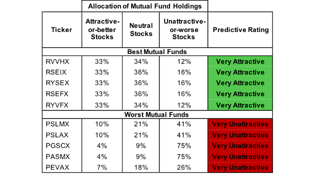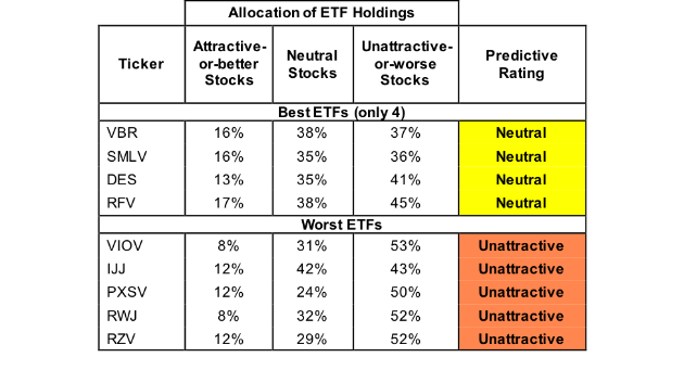 Invesco S&P Small Cap 600 Pure Value ETF (RZV) is the worst rated Small Cap Value ETF and PACE Small/Medium Value Equity Investments (PEVAX) is the worst rated Small Cap Value mutual fund. RZV earns an Unattractive rating and PEVAX earns a Very Unattractive rating.