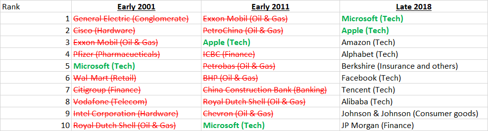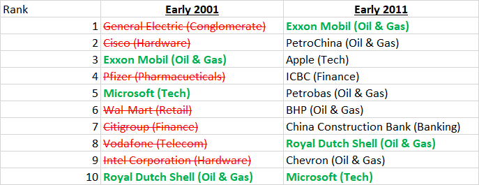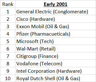This first list shows the 10 largest public companies on earth—ranked by market cap—in early 2001: