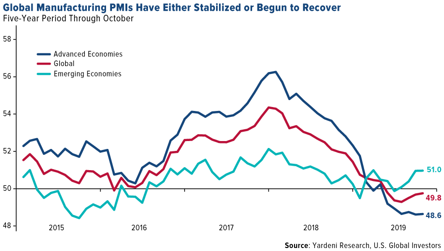 Also driving my bullishness right now is the likelihood that the global manufacturing purchasing manager’s index (PMI) looks to have either stabilized (in advanced economies) or begun to recover (in emerging economies). As I’ve explained many times before, the PMI is a leading indicator of commodities demand from factories and manufacturers.
