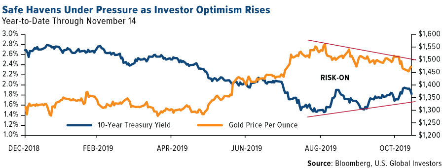 Safe haven assets, including gold, U.S. Treasury bonds and the Japanese yen, have normally receded in “risk-on” environments, and this cycle has been no exception. Gold prices have fallen around 6.3 percent from their six-year highs of more than $1,565 an ounce in early September.