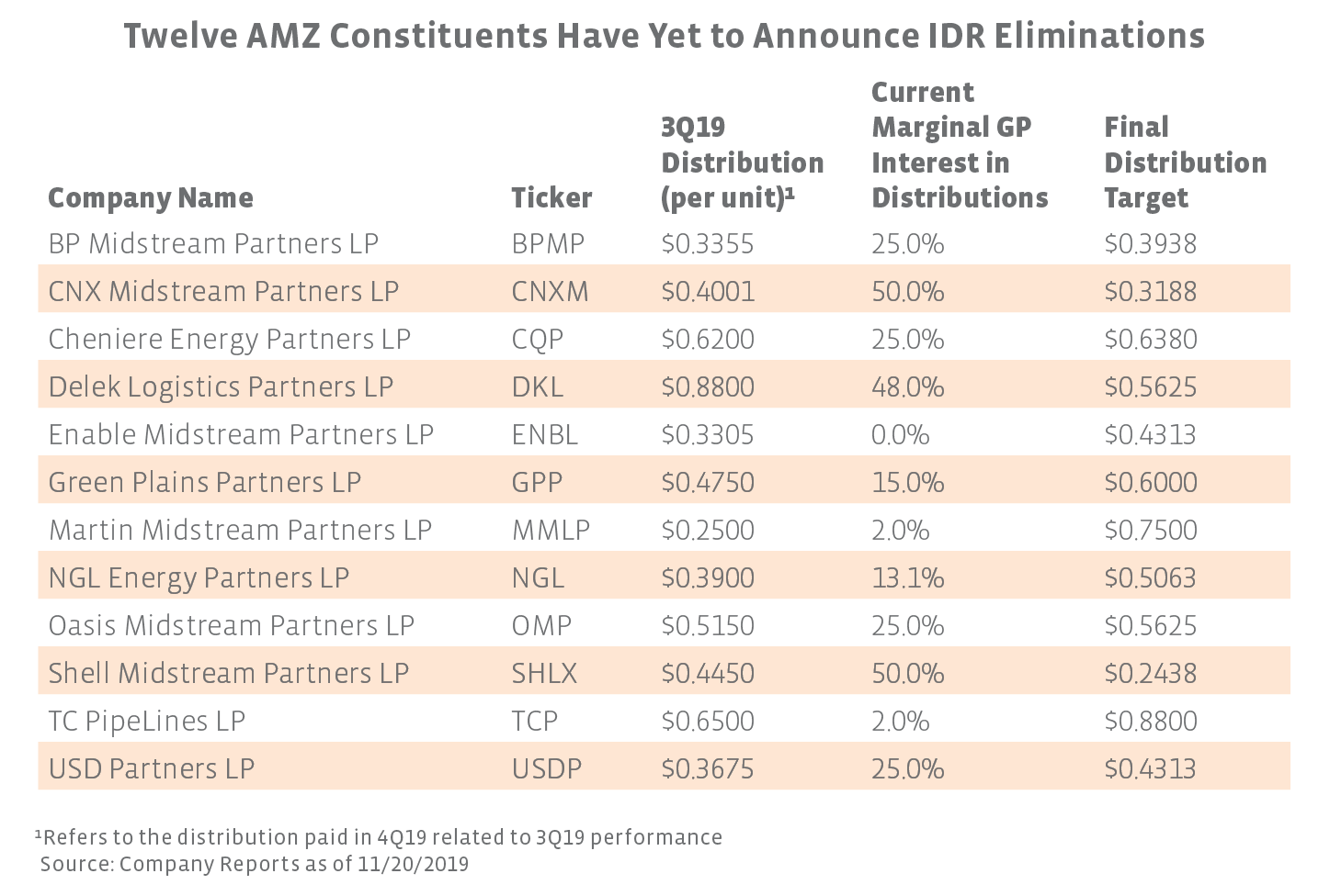 - Most of the remaining IDR holdouts in the AMZ Index are expected to eliminate their IDRs in time as the general partner’s take becomes more of a burden.